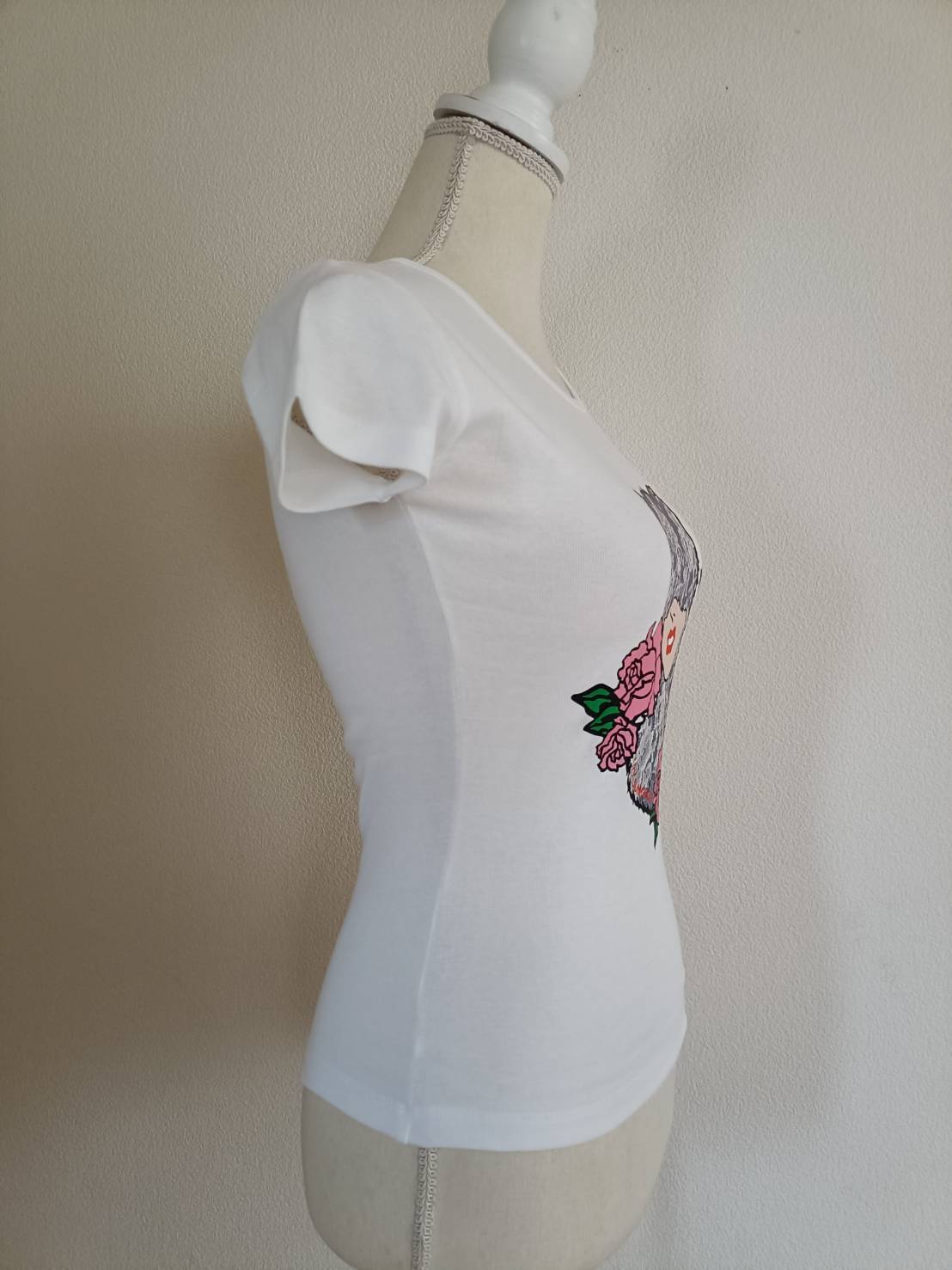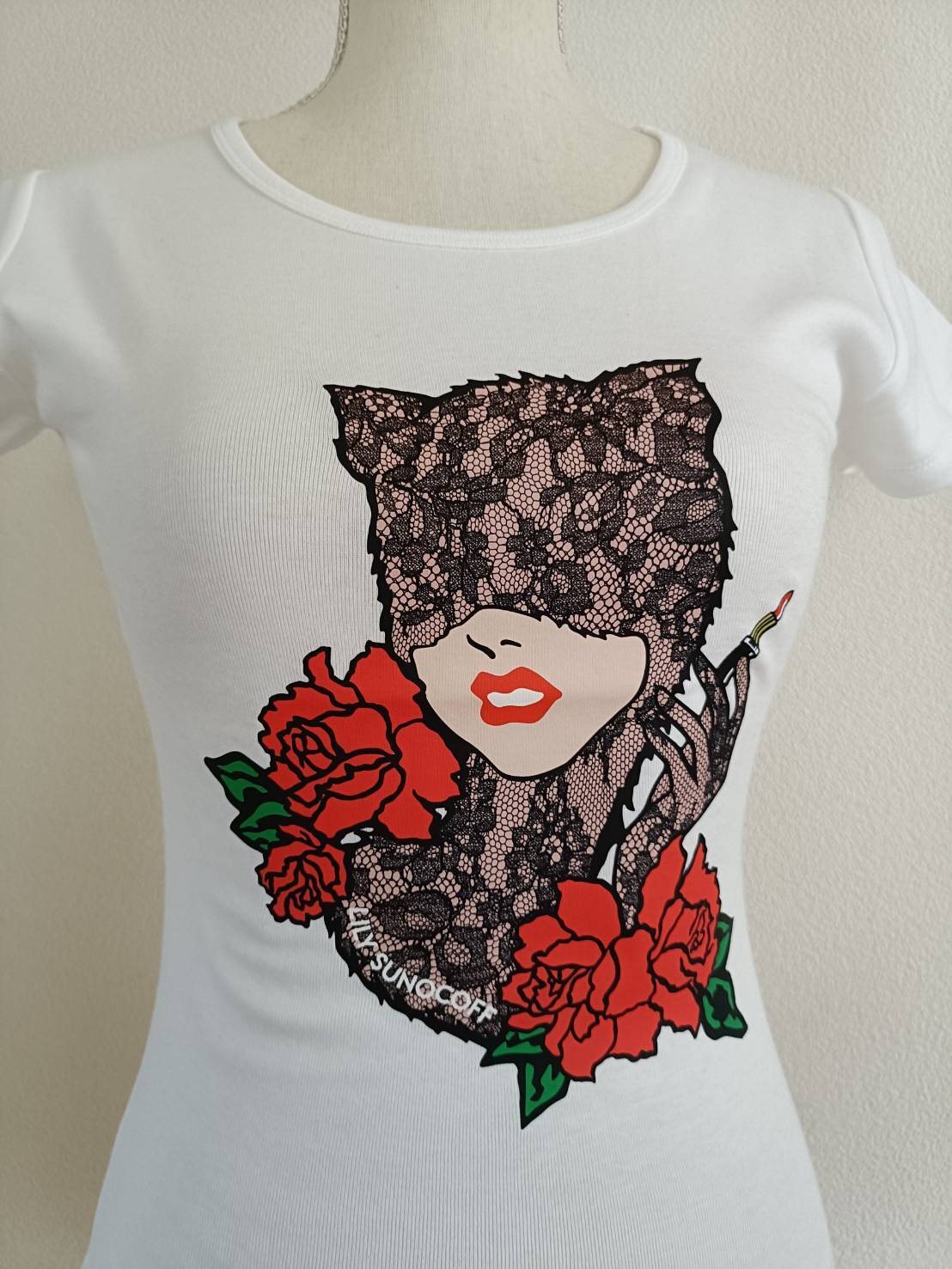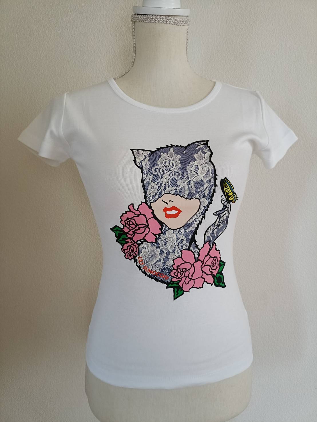 ホワイトベースにピンクローズ、レッドローズの2色展開。ポリエステル混のコットン素材で伸縮性に優れ、優しい肌ざわりで抜群の着心地です。