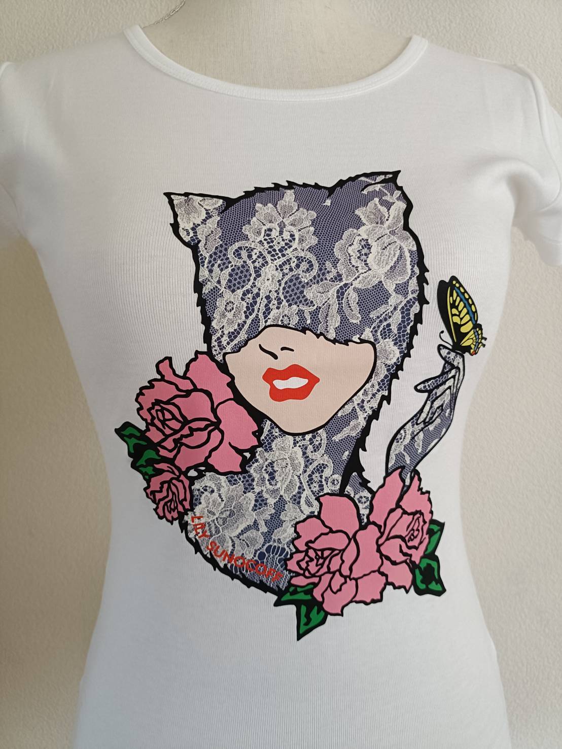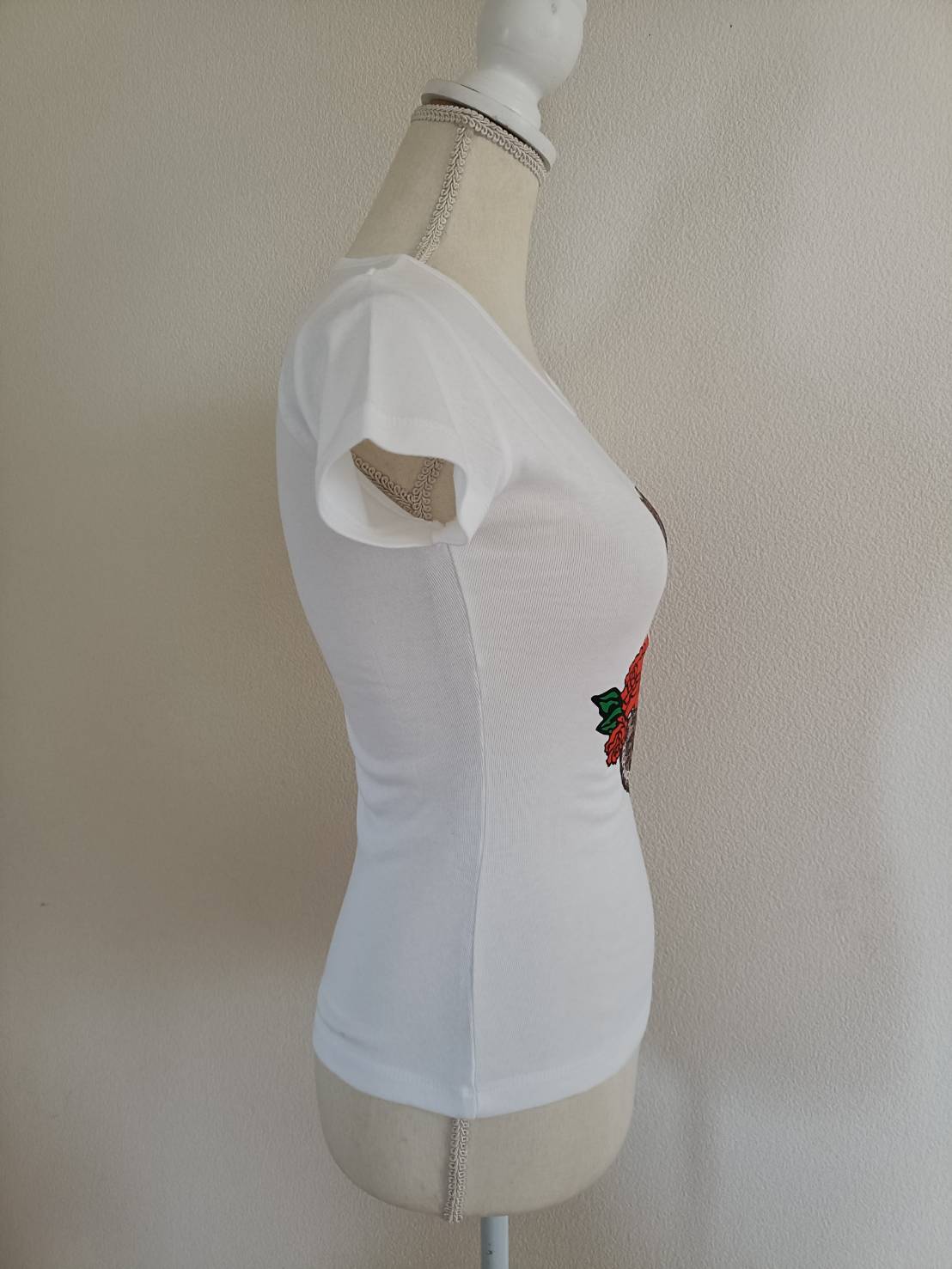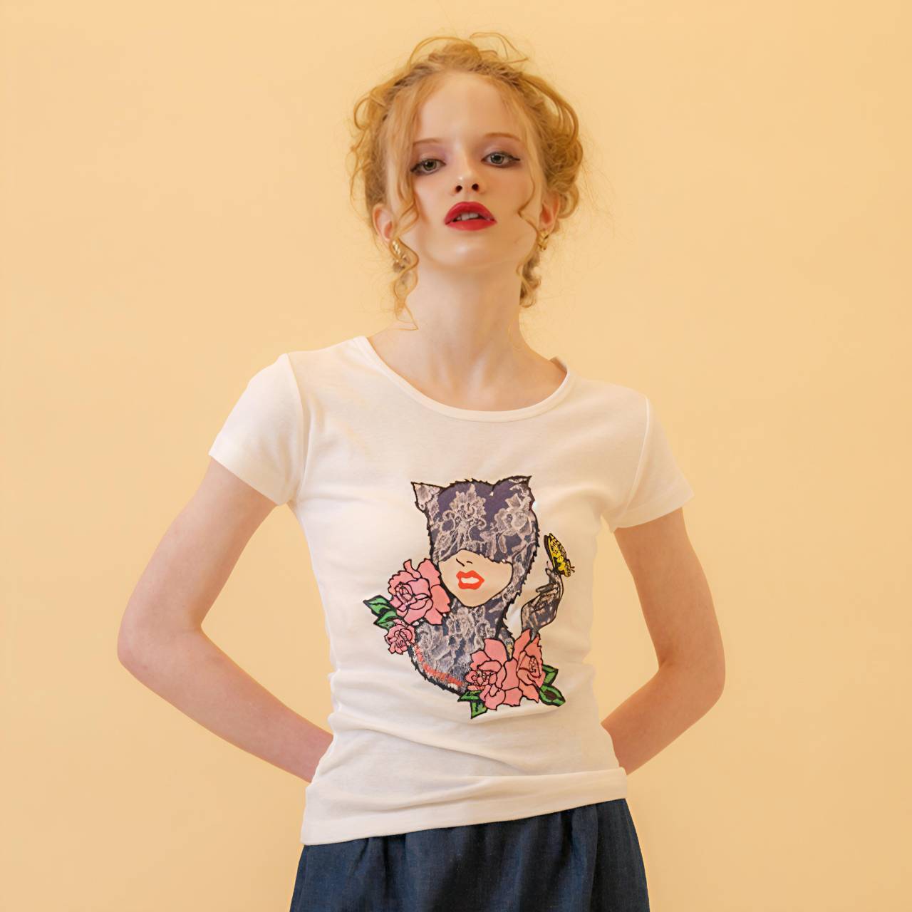 ホワイトベースにピンクローズ、レッドローズの2色展開。ポリエステル混のコットン素材で伸縮性に優れ、優しい肌ざわりで抜群の着心地です。