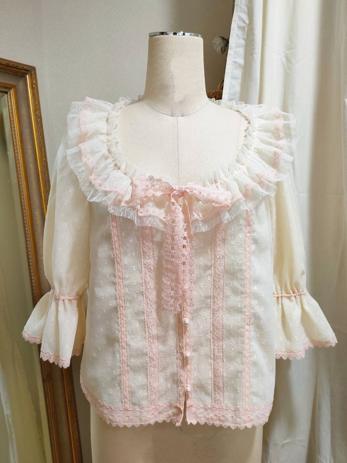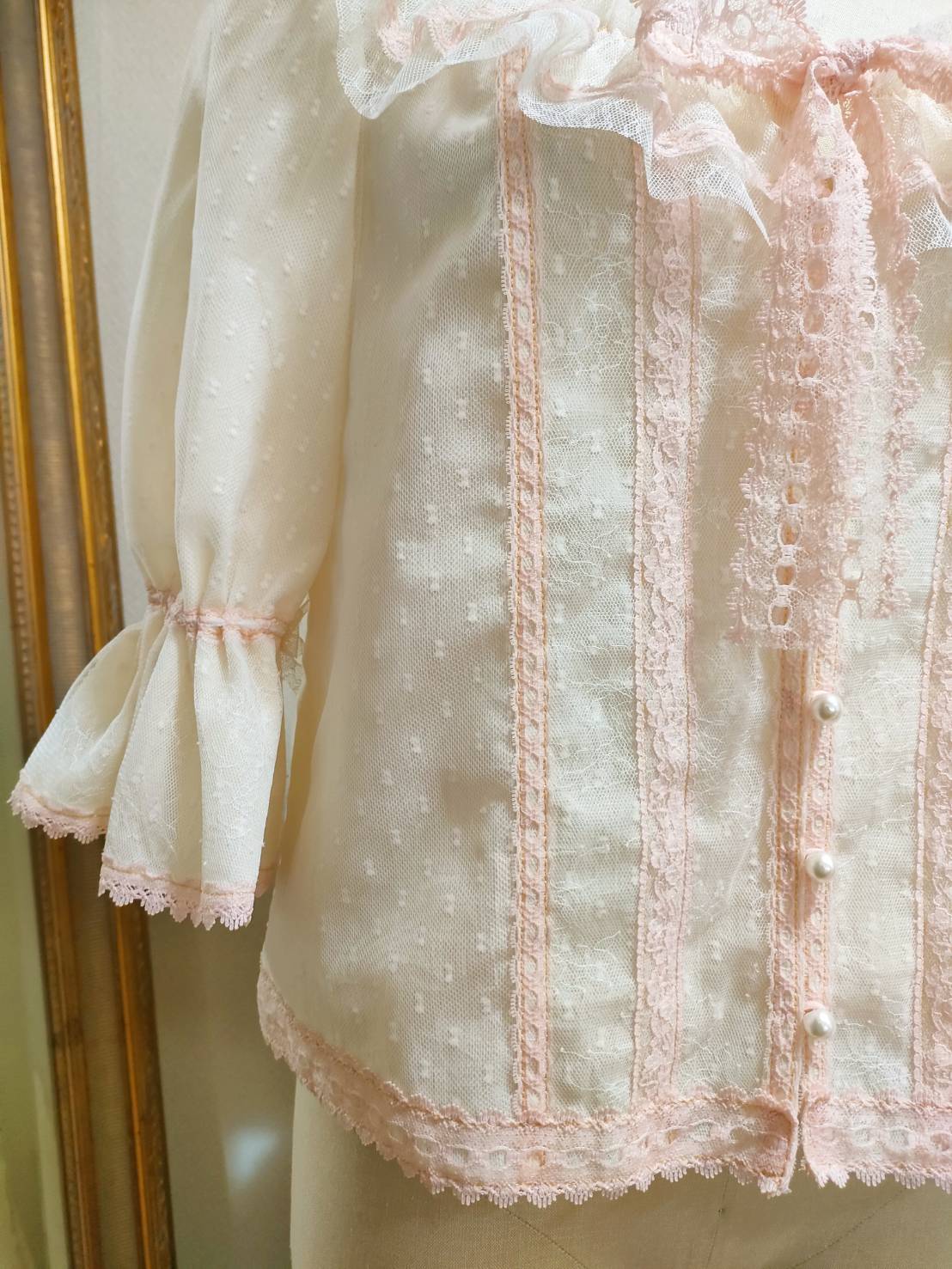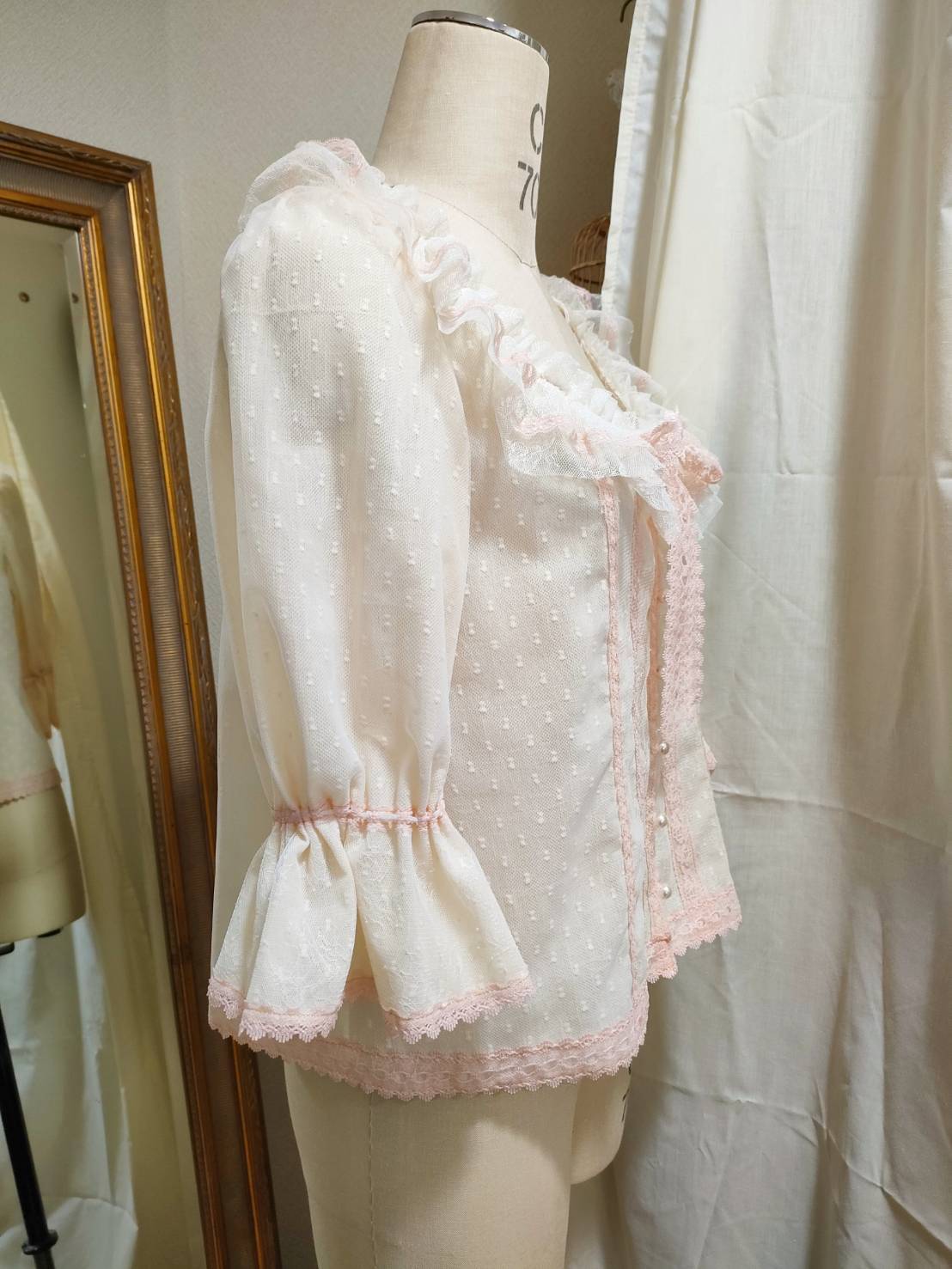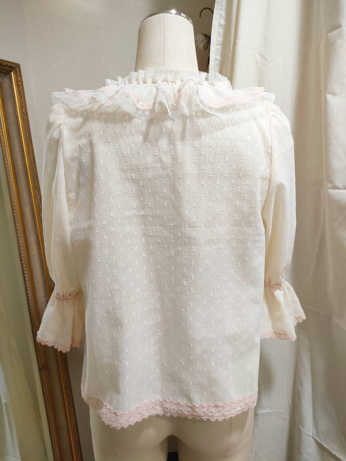 甘いお砂糖菓子のようなブラウスが出来上がりました♡ドットが可愛いコットンのカットドビー素材、全体にチュールをレイヤードし、たっぷりとレースをあしらった凝ったお作りです。