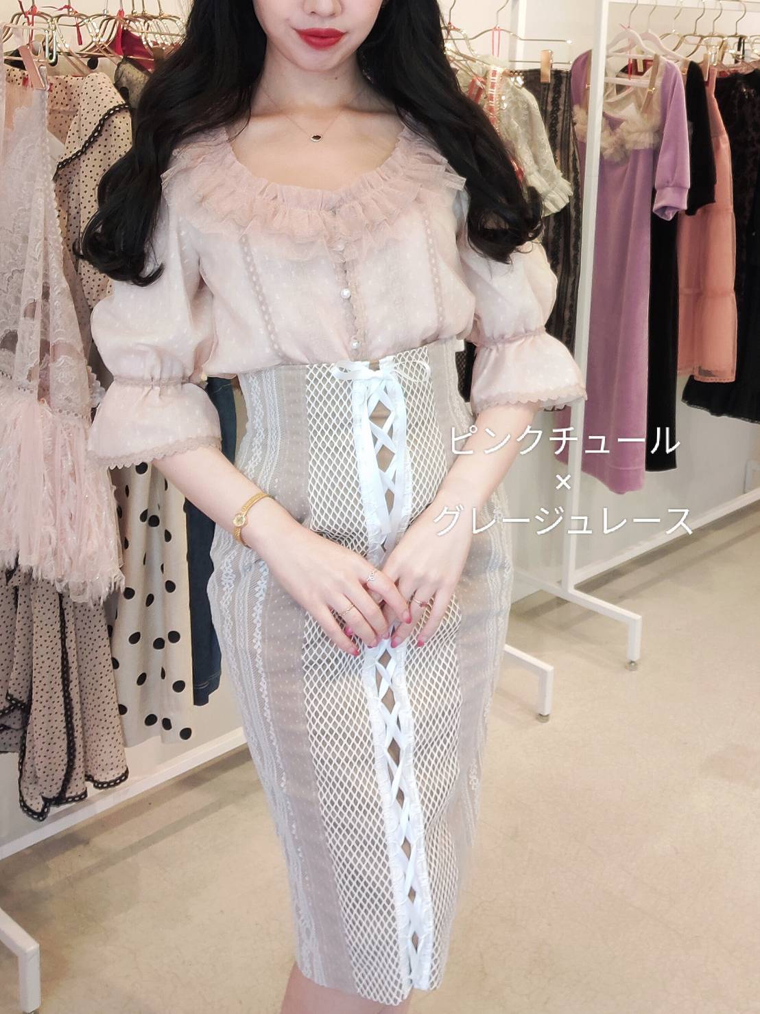 ※画像4&5枚目のスタッフ着用画像が、新色のグレージュレースです。アイボリー生地にピンクチュールを重ね、配色をグレージュにした、柔らかいコントラストです。