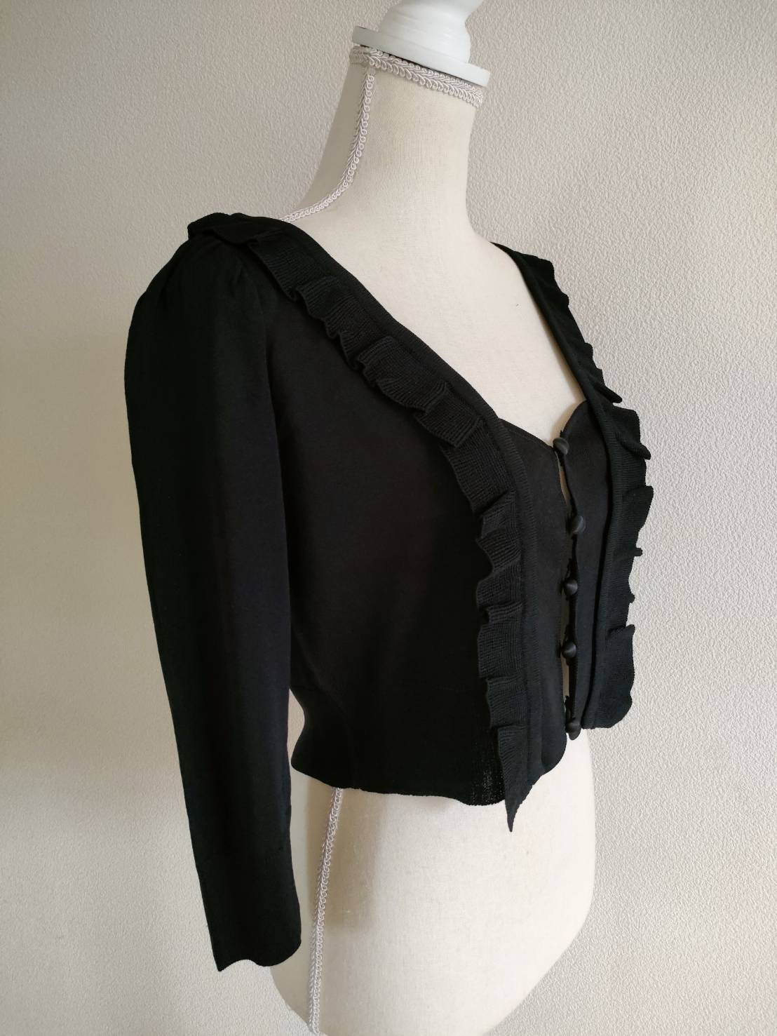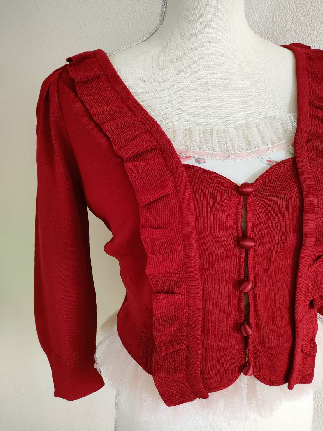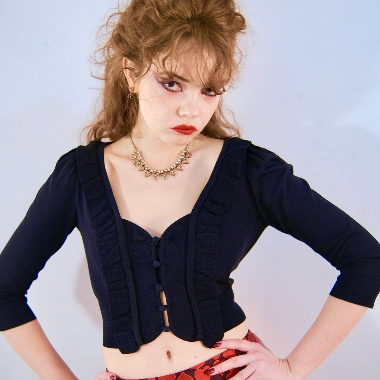 デコルテが美しく見えるハートネックに、くるみボタン、ちょうどよいボリュームのお襟のフリル、短めの着丈でワンピースやスカートともバランスが取りやすいです。