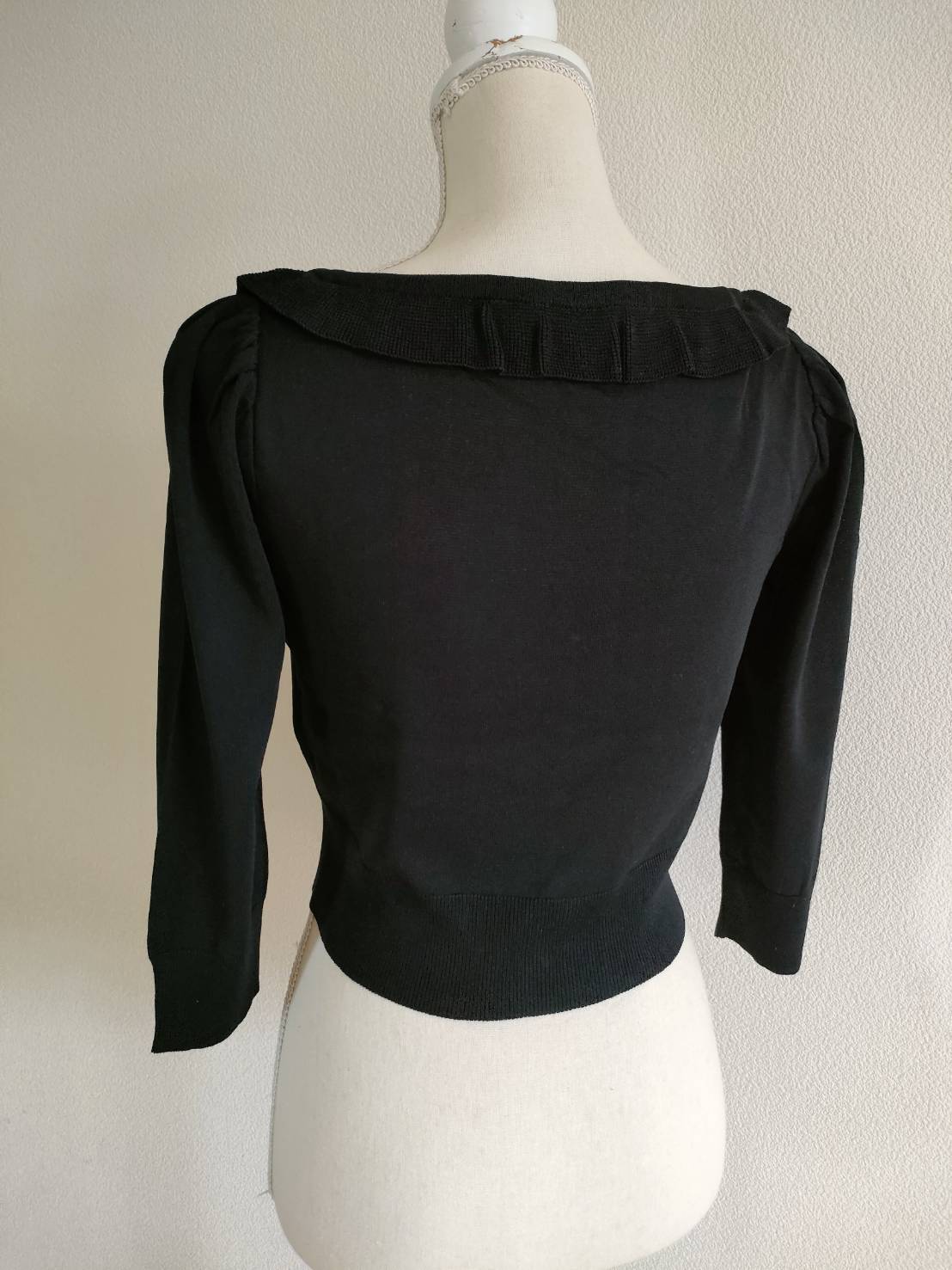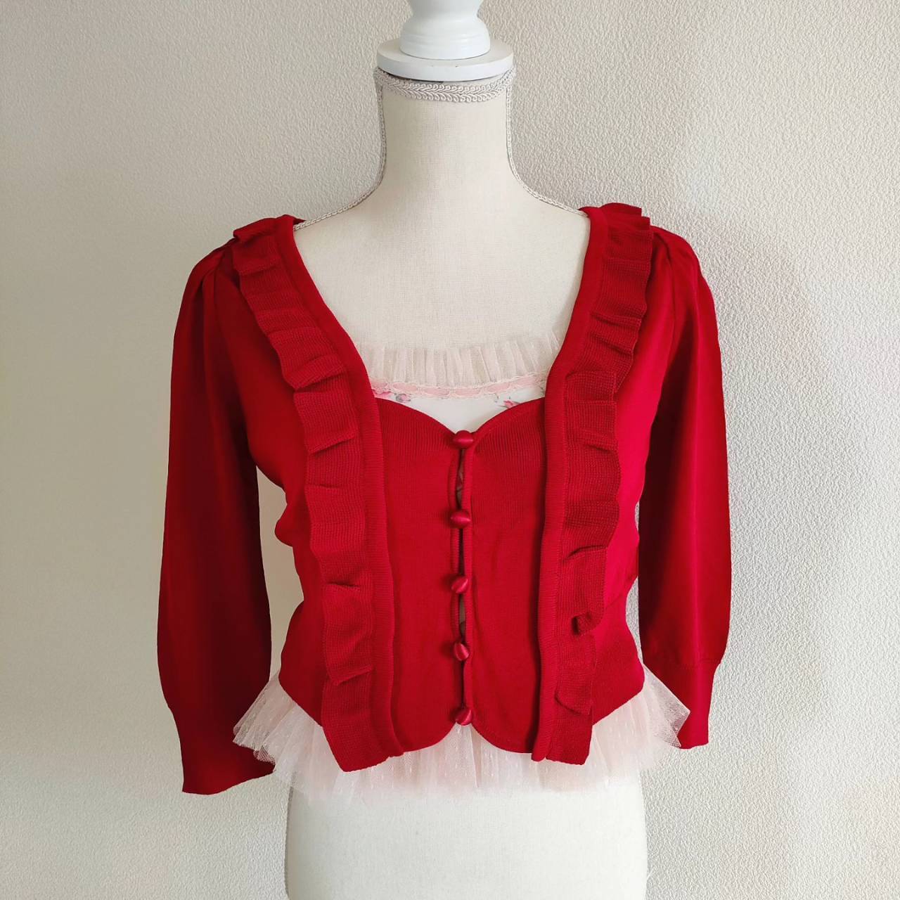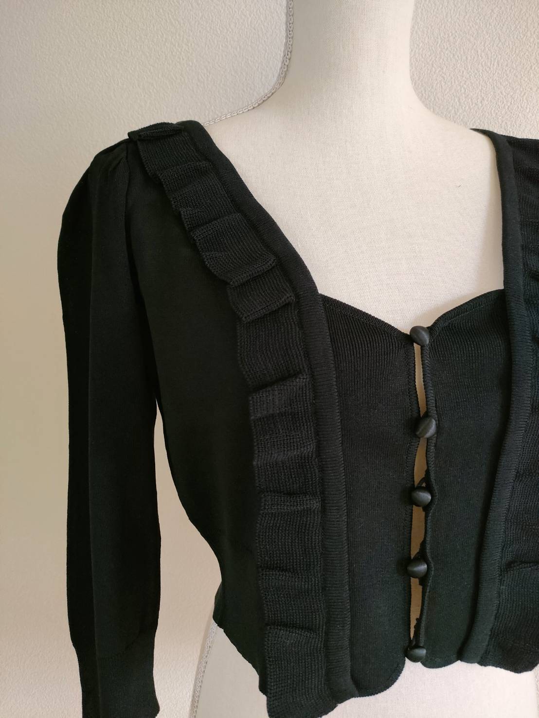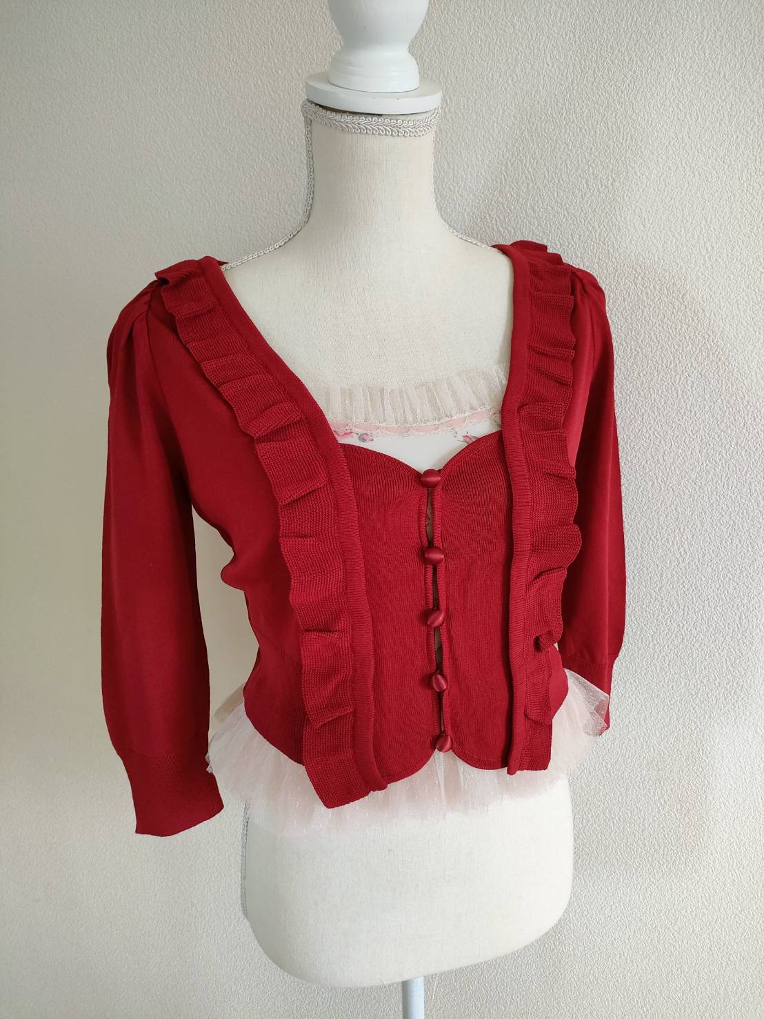 デコルテが美しく見えるハートネックに、くるみボタン、ちょうどよいボリュームのお襟のフリル、短めの着丈でワンピースやスカートともバランスが取りやすいです。
